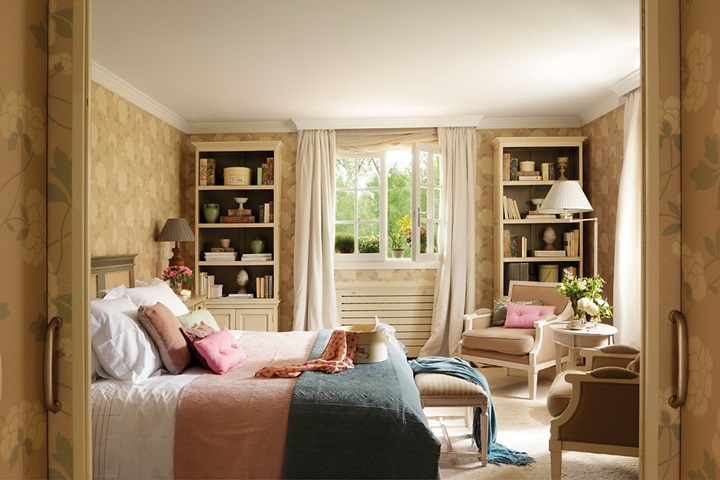 Pastel renklerin ağırlıkta olduğu bu yatak odası romantik detaylarla suslenmiş. Duvar kagıdından perde secımıne klasık tarzın vurgulandıgı bu yatak odası vintaje severlere hitap ediyor.